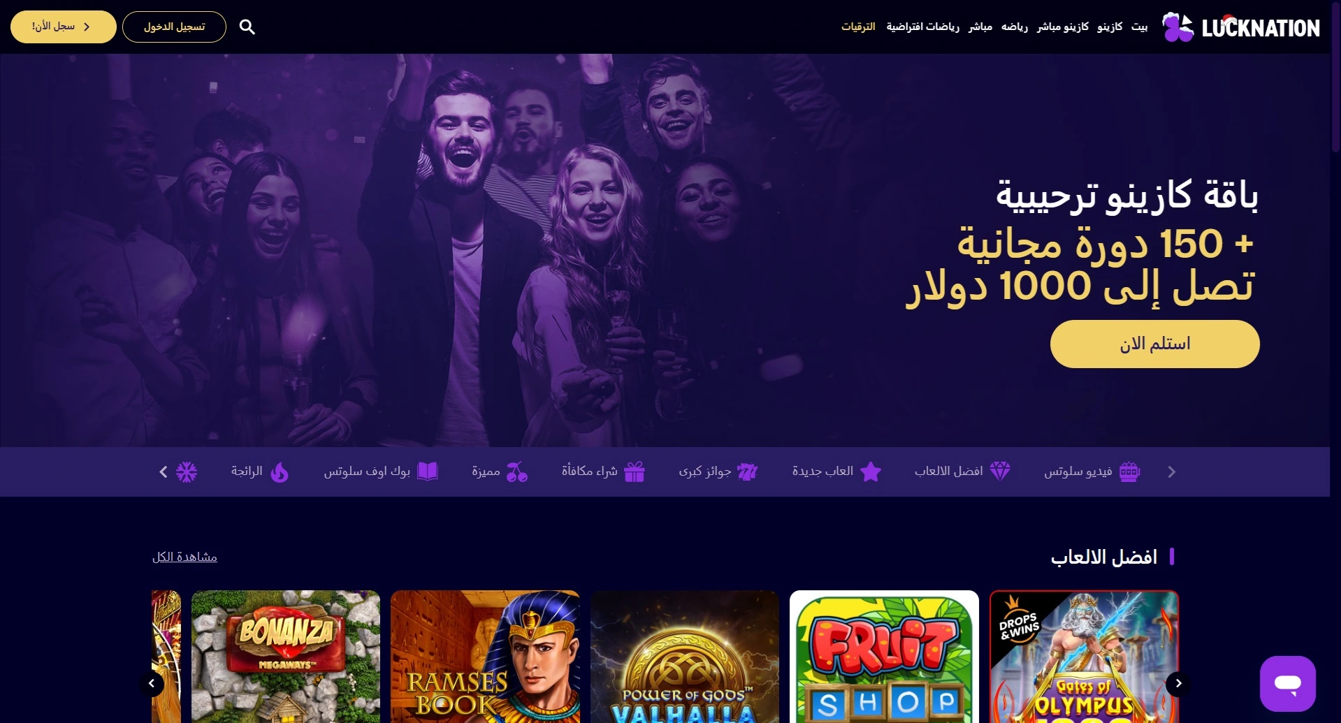 قسم Slots يحتوي على مئات الألعاب من مزودين مشهورين. ستجد ألعاب كلاسيكية وحديثة مع موضوعات مختلفة. سلوتس LuckNation عالية RTP متوفرة مع نسب عودة تصل إلى 98%.