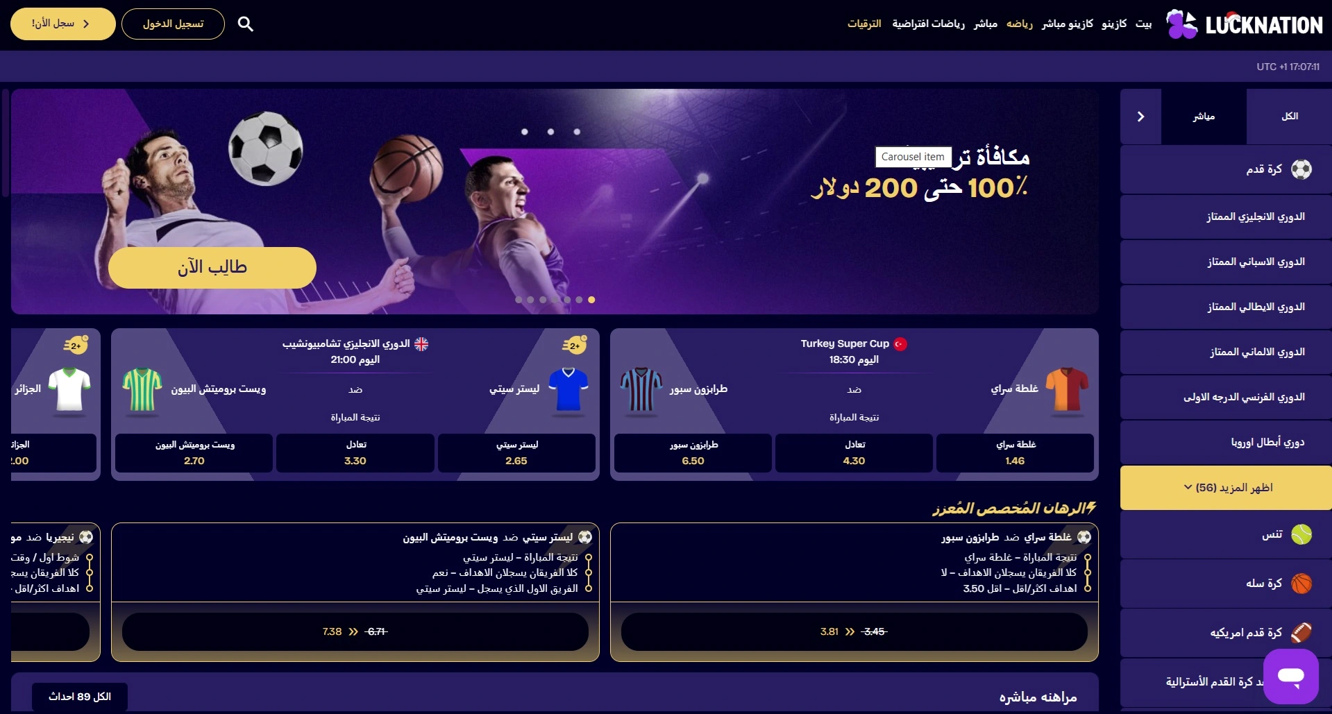مراهنات مباشرة LuckNation تتيح لك المراهنة أثناء سير المباريات. الاحتمالات تتحدث بشكل فوري حسب أحداث المباراة. بعض الأحداث توفر بث مباشر لمتابعة المباراة والمراهنة في نفس الوقت.