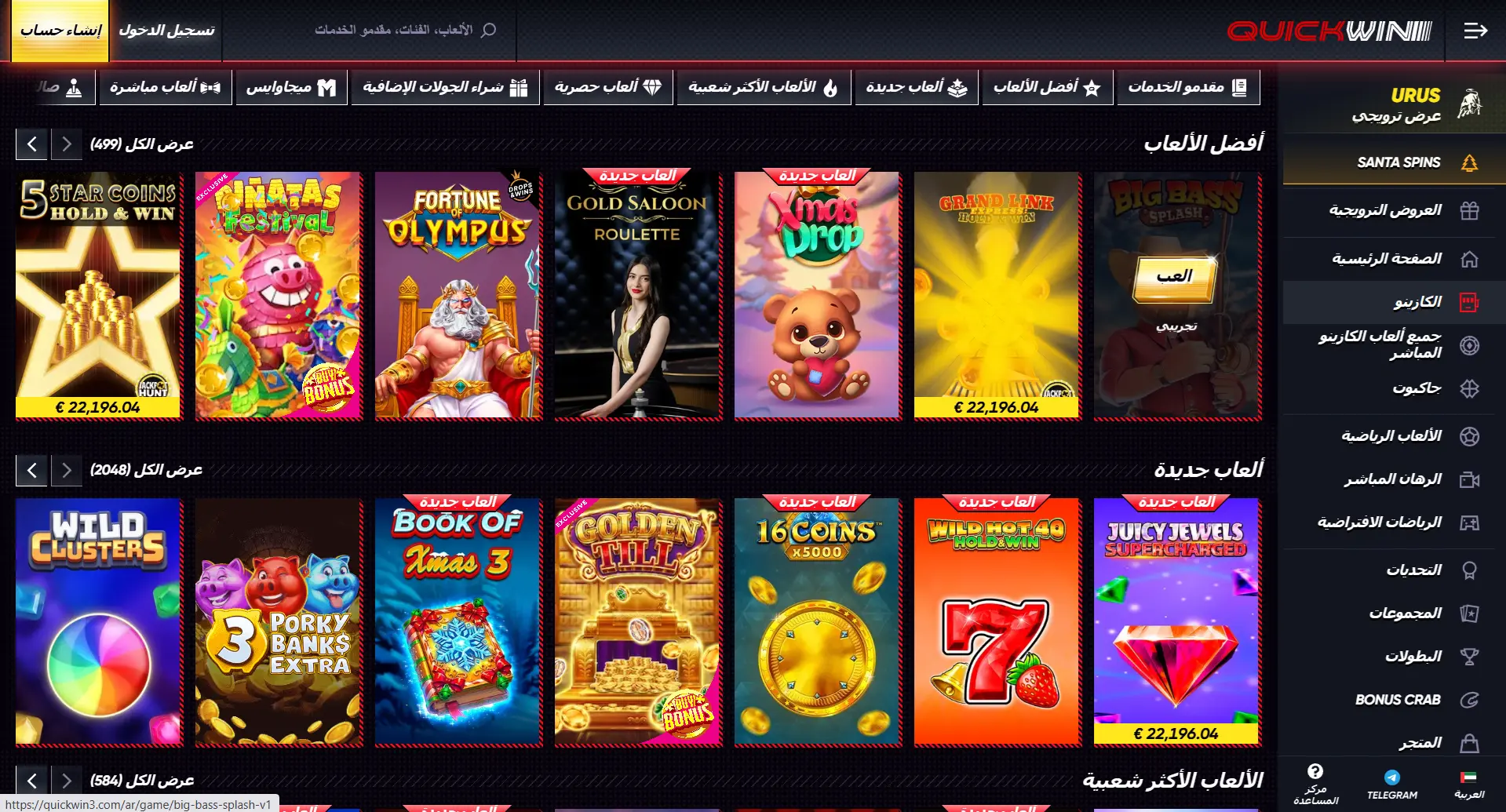 بعض الألعاب توفر QuickWin high RTP slots مع نسب عائد تتجاوز 96%. هناك أيضاً سلوتس بجوائز كبرى (Jackpots) حيث يمكن أن تصل الأرباح لملايين الدراهم. الألعاب الشعبية تشمل Sweet Bonanza، Gates of Olympus، Book of Dead، وStarburst.